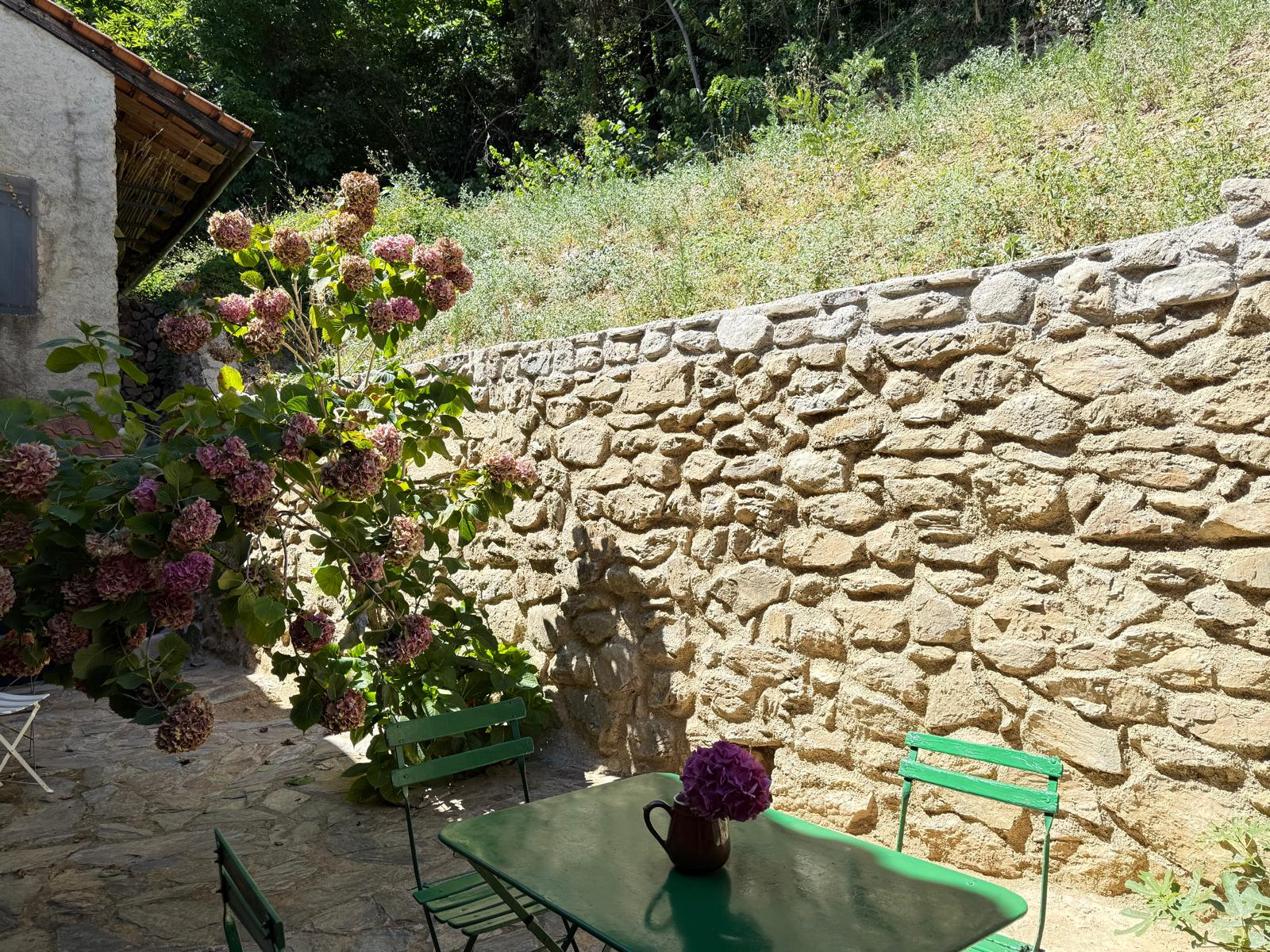 matériaux authentiques, et son agréable jardin non attenant (à 5m de la maison) de 930m² et sa magnifique terrasse offrant une vue dégagée sur les montagnes, comprenant :