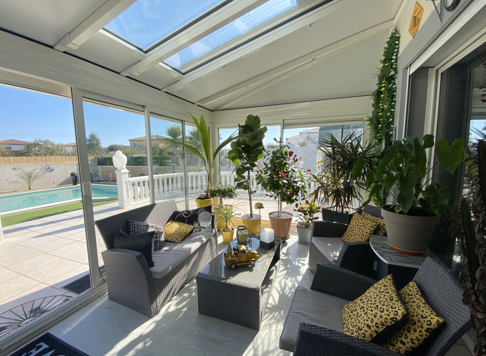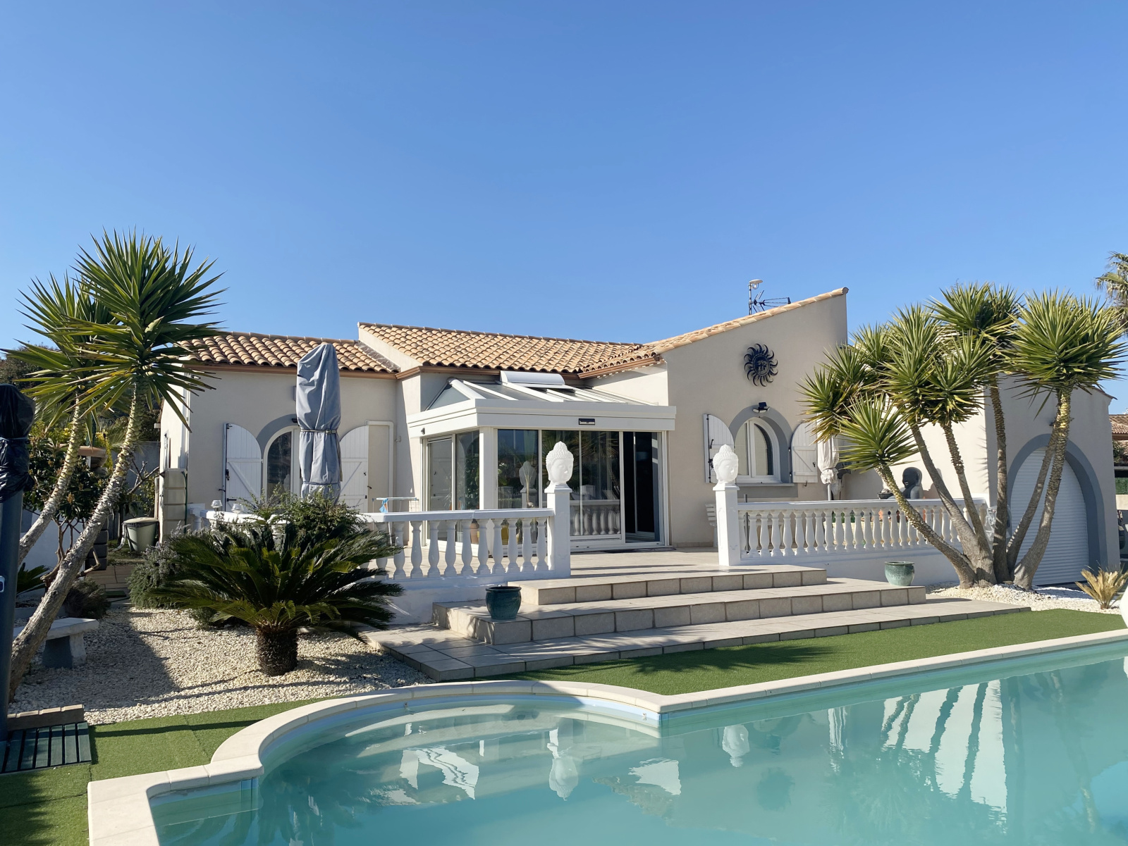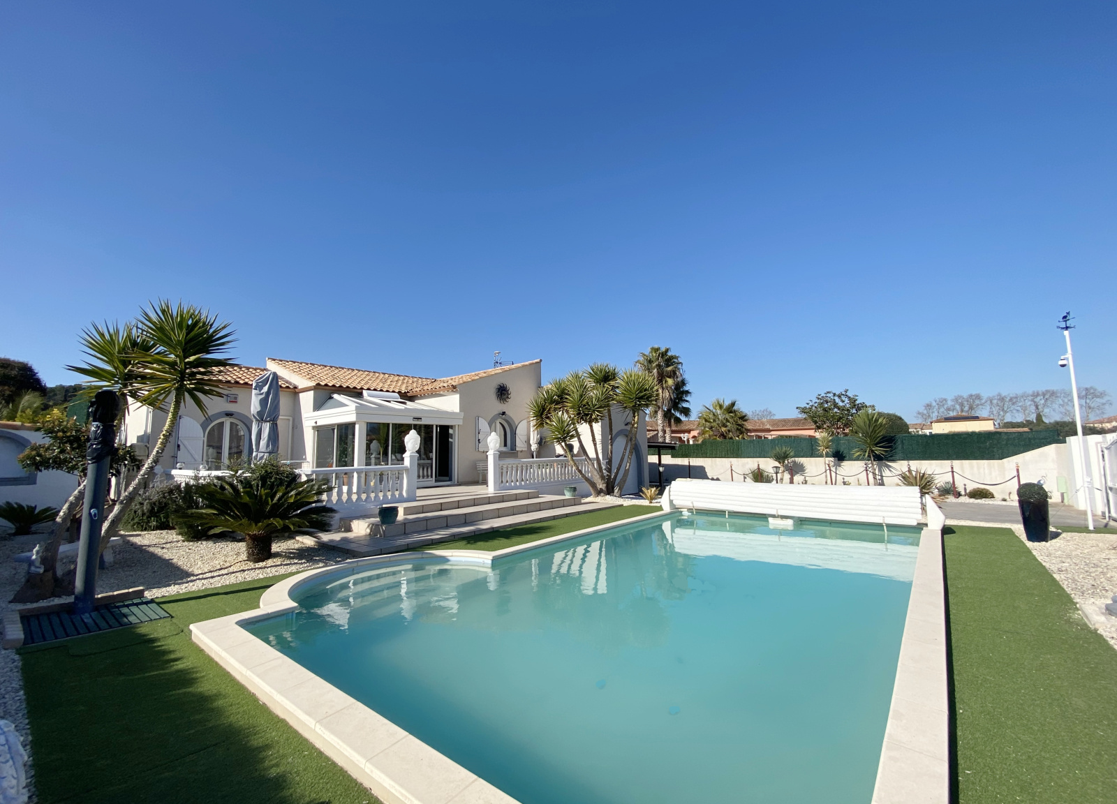 Poussan (34560)Coup de cœur pour cette superbe villa plain-pied située dans une impasse calme à proximité immédiate des commerces. La maison bénéficie d’un grand séjour de plus de 40 m2 prolongé d’une agréable véranda donnant sur la terrasse et la piscine. Cuisine ouverte entièrement équipée, trois belles chambres avec placard, spacieuse salle de bain avec douche et baignoire, wc indépendant. Climatisation réversible dans la pièce à vivre et dans chaque chambre. Côté jardin, des extérieurs clos parfaitement entretenus avec une piscine 9/ 4.5 bien exposée et sans vis-à-vis pour profiter pleinement des journées ensoleillées. Grande allée goudronnée permettant de stationner plusieurs véhicules/camping-car, garage carrelé, carport avec prise pour voiture électrique, abri de jardin, portail motorisé… Un bien rare, idéalement situé, à visiter sans tarder !