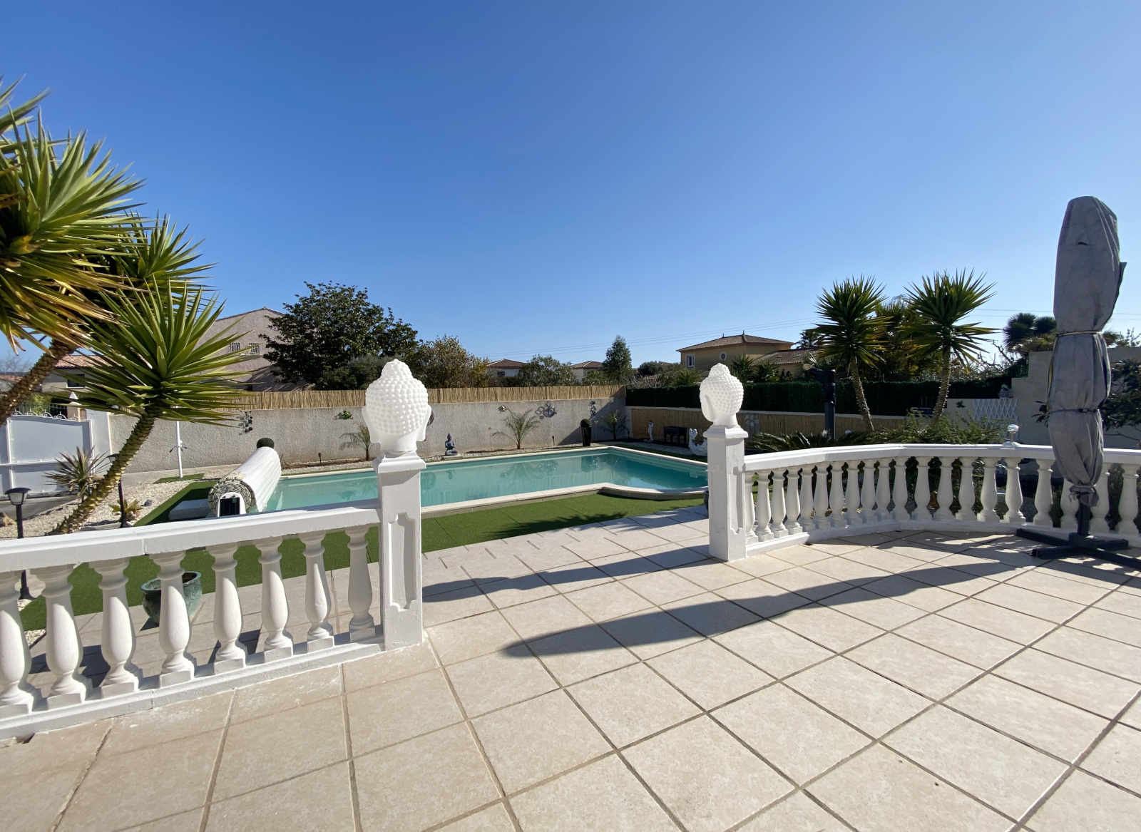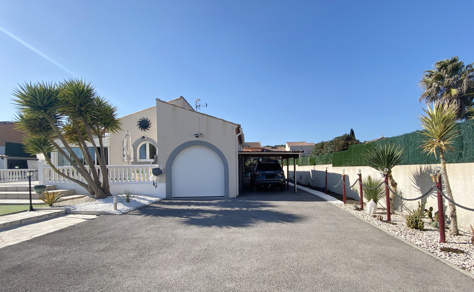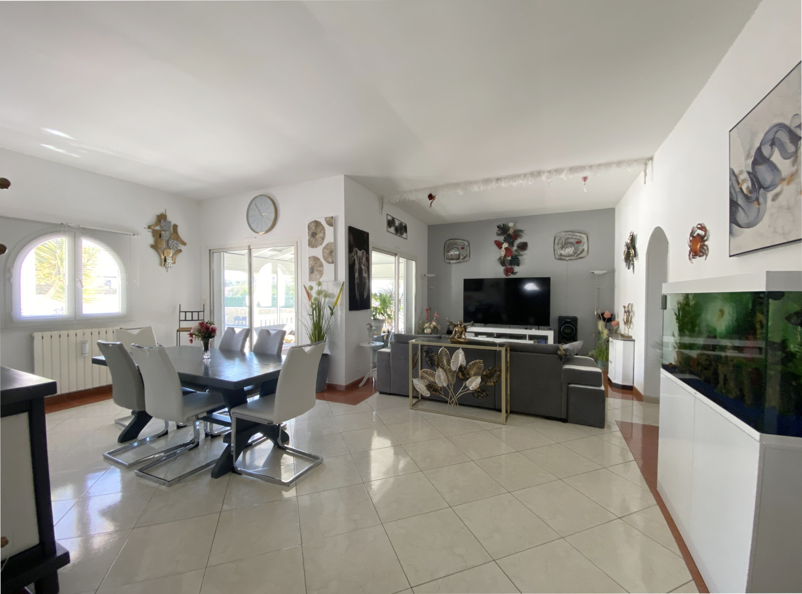 Poussan (34560)Coup de cœur pour cette superbe villa plain-pied située dans une impasse calme à proximité immédiate des commerces. La maison bénéficie d’un grand séjour de plus de 40 m2 prolongé d’une agréable véranda donnant sur la terrasse et la piscine. Cuisine ouverte entièrement équipée, trois belles chambres avec placard, spacieuse salle de bain avec douche et baignoire, wc indépendant. Climatisation réversible dans la pièce à vivre et dans chaque chambre. Côté jardin, des extérieurs clos parfaitement entretenus avec une piscine 9/ 4.5 bien exposée et sans vis-à-vis pour profiter pleinement des journées ensoleillées. Grande allée goudronnée permettant de stationner plusieurs véhicules/camping-car, garage carrelé, carport avec prise pour voiture électrique, abri de jardin, portail motorisé… Un bien rare, idéalement situé, à visiter sans tarder !