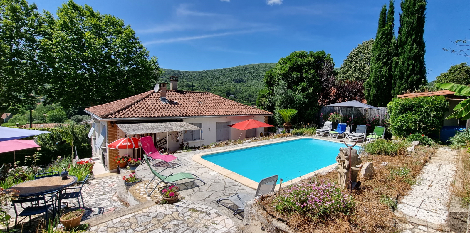 Ganges (34190)A deux pas du centre ville, maison comprenant au rez de chaussée : 2 chambres en enfilades, salle d'eau et wc, cave, cellier et garage. Au 1er étage : entrée, cuisine donnant sur une grande terrasse, séjour avec cheminée, 2 chambres, bureau, salle d'eau, wc. Joli terrain arborée de 900m² avec piscine 8X4 et terrasse, belle vue dégagée. Annonce rédigée et publiée par un mandataire indépendant EI Cédric Athanassaras RSAC de Montpellier 450584719. Les informations sur les risques auxquels ce bien est exposé sont disponibles sur le site Géorisques : www.georisques.gouv.fr